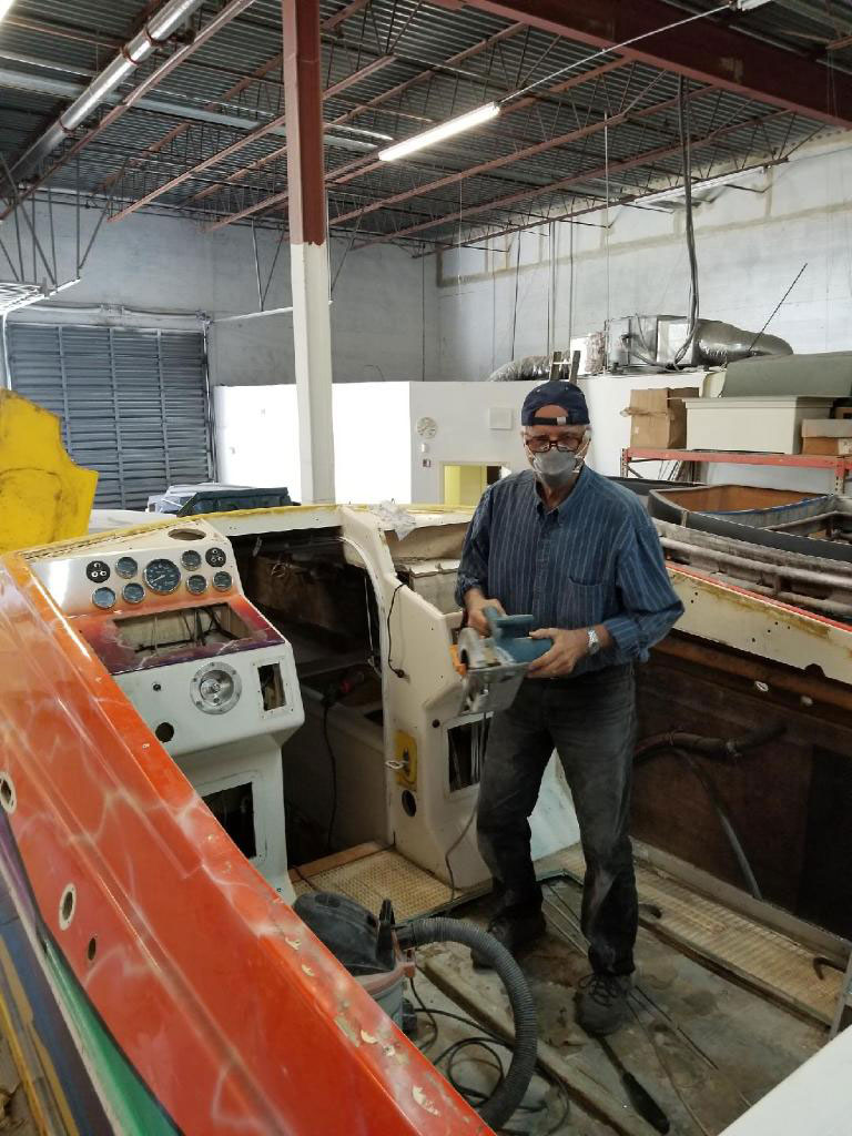 FROM THERE THE BOAT WENT TO BOBBY’S SHOP IN HALLANDALE FL WHERE ALL OF THE HARDWARE WAS REMOVED AND THE REST OF THE BOAT WAS STRIPPED DOWN TO THE FIBERGLASS HULL AND DECK. AT 80+ YEARS OLD, BOBBY SACCENTI HIMSELF, REMOVED MUCH OF THE HARDWARE, FLOORING AND EVEN THE GAS TANKS.