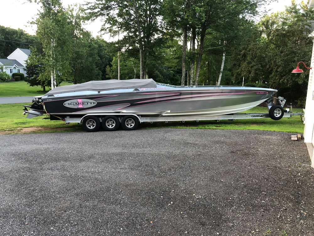 I TOLD HIM TO SEND ME SOME PICTURES OF THE BOAT AND IMEDIATELY FORWARDED THEM TO WIKI- BOBBY. BOBBY LAUGHED WHEN HE SAW THE PICTURES AND TOLD ME IT WASN’T ACTUALLY AN APACHE AND THAT IT WAS ACTUALLY A MORE MODERN 42’ “CHIEF POWERBOAT”. HE PROCEEDED TO TELL ME ALL ABOUT HIS JOURNEY AND HOW HE INVENTED AND DESIGNED THE BOAT AND THE EVOLUTION OF HOW THE CHIEF HULL AND COMPANY CAME TO PASS. THE GREAT THING ABOUT THE CHIEFS IS THAT THEY HAVE THE SAME HULL SHAPE AND DECK STYLING AS THE OLD-SCHOOL APACHES BUT THEY HAVE A NEW-SCHOOL REVERSE STEP AND NEGATIVE CHINE THAT MAKES THEM 15 MPH FASTER THAN THE APACHES IN CALM WATER WITH THE SAME POWER. THEY ARE ALSO, 1-FOOT LONGER AND WERE ALL BUILT AFTER 2006. THEY ALSO HAVE LARGE PLEASURE CABINS, 5 PERSON COCKPITS AND HUGE FULL-STAGGERED ENGINE COMPARTMENTS. THE BAD PART IS THAT THEY ONLY BUILT 6 OF THEM SO GOOD LUCK TRYING TO FIND ONE LET ALONE GETTING SOMEONE TO SELL IT TO YOU. TO MAKE MATTERS WORSE, ONE OF THEM IS A FULL RACE BOAT WITH ARNESON DRIVES AND HAS BEEN POUNDING AROUND ENGLAND FOR YEARS. ANOTHER ONE HAS A FULL ILMORE SETUP AND UNFORTUNATELY HAS THE PROBLEMATIC INDY DRIVES CUT INTO THE TRANSOM. ONE IS A DIESEL BOAT THAT IS OUT OF THE COUNTRY. ONE WAS A HYBRID DEAL THAT WAS LAID UP AND BUILT BY CHECKMATE (NOT CHIEF). THERE IS A HULL AND DECK SOMEPLACE THAT VERY FEW KNOW ABOUT OR CAN FIND. THE LAST ONE IS THE ORIGINAL “FIRST MOHICAN” CHIEF THAT BOBBY BUILT WITH THE HAND SELECTED TEAM THAT LAUNCHED THE CHIEF BRAND AND IT ACTUALLY ALSO HAD #6 DRY-SUMP DRIVES HANGING OFF THE TRANSOM. IN THE END, THERE WAS REALLY ONLY ONE OF THESE 6 BOATS WHICH FIT WHAT I WAS LOOKING FOR.